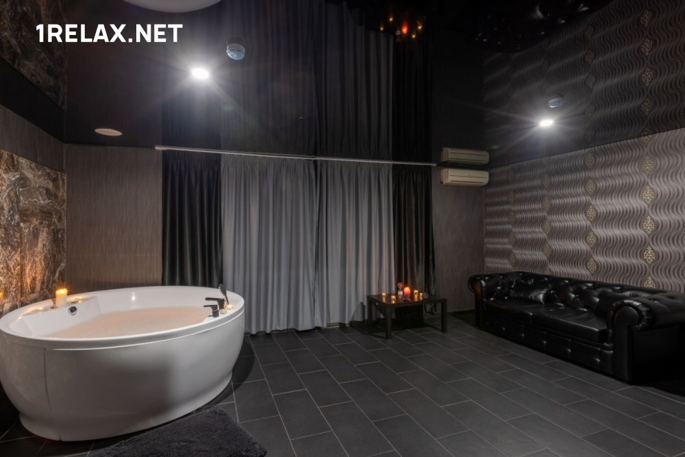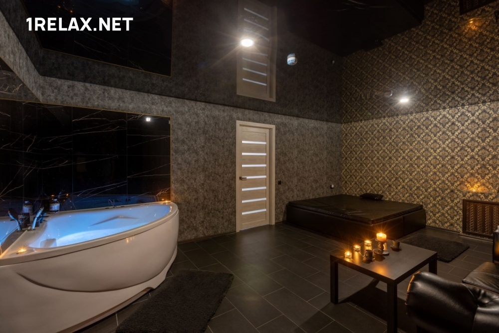 Для сеансов приготовлены большие кровати, а для водных процедур — душ и джакузи. Комфортную температуру обеспечивает кондиционер.